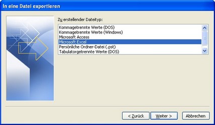 Öffnen Sie Outlook und wechseln Sie in den Bereich „Kontakte“. Wählen Sie im Menü „Datei“ den Eintrag „Importieren/Exportieren“. Sie starten einen Assistenten, der Sie durch die einzelnen Abschnitte führt. Im ersten Schritt legen Sie fest, welche Aktionen Sie durchführen wollen. Hier wählen Sie „Exportieren in eine Datei“ und klicken auf „Weiter“.