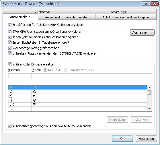 In der Liste „Während der Eingabe ersetzen“ können Sie Wörter eingeben, die Sie häufig falsch schreiben oder Wörter aus der Liste streichen, die nicht korrigiert werden sollen. Legen Sie zudem über das Register „AutoFormat“ fest, wie formatierter Text behandelt werden soll.