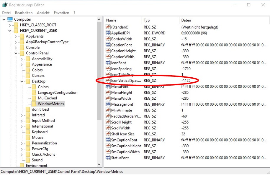 2) Dort navigieren Sie zu „HKEY_CURRENT_USER\Control Panel\Desktop\WindowMetrics“ und klicken dort doppelt auf den Schlüssel „IconVerticalSpacing“ und ändern den Wert von „-1710“ auf „-1125“.