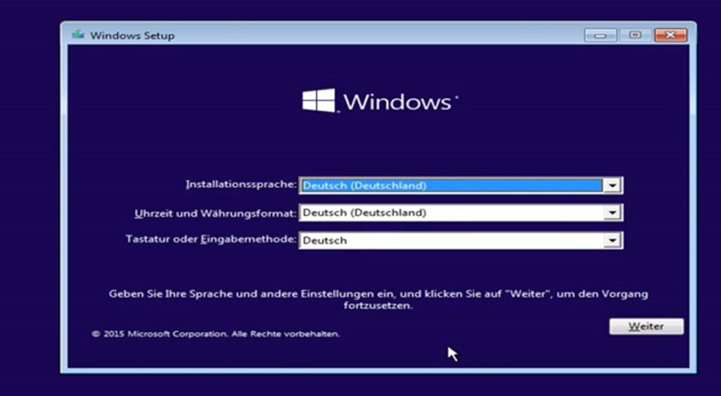 2) PC herunterfahren und von dem Medium booten. Sie gelangen ins Setup-Menü. Wählen Sie dort die richtige Sprache aus und klicken dann unten rechts auf „Weiter“.