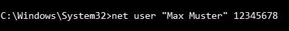 17) Nun können wir mit dem Befehl „net user „Max Muster“ 12345678″ dem Benutzer Max Muster Das Passwort 12345678 geben und dann mit „exit“ das Fenster verlassen.