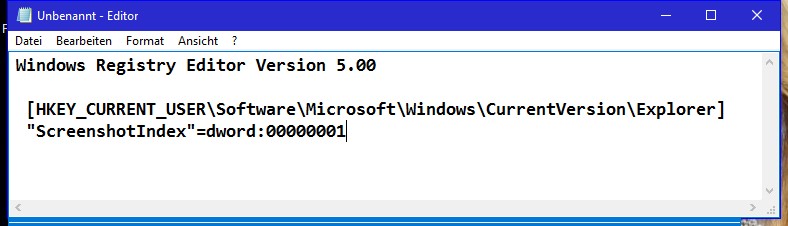 Nun das ganze speichern als „Screenshotzähler zurücksetzten.reg“. Sie können natürlich auch einen anderen Namen vergeben. Wichtig ist einfach das Sie es als .reg abspeichern. Nun einfach einen Doppelklick darauf und der Zähler wird auf „1“ zurückgesetzt.