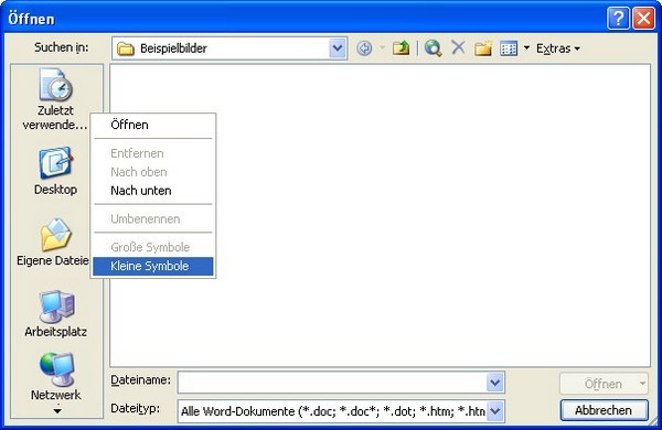 Beim Öffnen einer Datei finden Sie auf der linken Seite die Quick-Links. Diese Links können Sie an eigene Vorstellungen anpassen. Zeigen Sie mit „Strg+O“ den Dateidialog an. Klicken Sie in die linke Fläche, wo Sie die Symbole sehen (u.a. „Verlauf“ und „Eigene Dateien“). Klicken Sie hier mit der rechten Maustaste und wählen Sie im Kontextmenü „Kleine Symbole“.