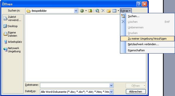 Navigieren Sie zu einem Verzeichnis Ihrer Wahl und wählen Sie es im Dateidialog. Wählen Sie auf dem Dropdown-Menü „Extras“ rechts oben die Option „Zu meiner Umgebung hinzufügen“. Das Verzeichnis erscheint im Dateidialog in der Liste links.