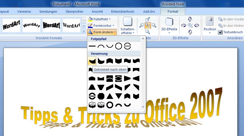 Mit Word 2007 können Sie Ihre Texte mit dreidimensionalen Überschiften aufpeppen. Die Funktion ist allerdings in der neuen Office-Version etwas versteckt untergebracht. Setzen Sie die Schreibmarke an die Stelle, an der die 3D-Überschrift erscheinen soll. Dann klicken Sie auf das Register „Einfügen“ und in der Menüleiste darunter auf die Fläche „WordArt“. Im darauffolgenden Fenster wählen Sie per Mausklick einen passenden Überschriftentyp aus. Im nächsten Fenster tragen Sie den Text der Überschrift ein. Wählen Sie in den Auswahlmenüs darüber die Schriftart und den Schftgrad aus. Mit einem Klick auf „OK“ erscheint die Überschrift daraufhin im Bearbeitungsfenster. Nun Können Sie noch die Grösse (Breite und Höhe) der Überschrift anpassen. Dazu ziehen Sie die Überschrift an den Eckpunkten des Skalierrahmens mit gedrückter Maustaste in die gewünschte Grösse. Über das Register „Format“ finden Sie viele weitere Farb-, Form- und Platzierungsmenüs für zusätzliche Effekte.