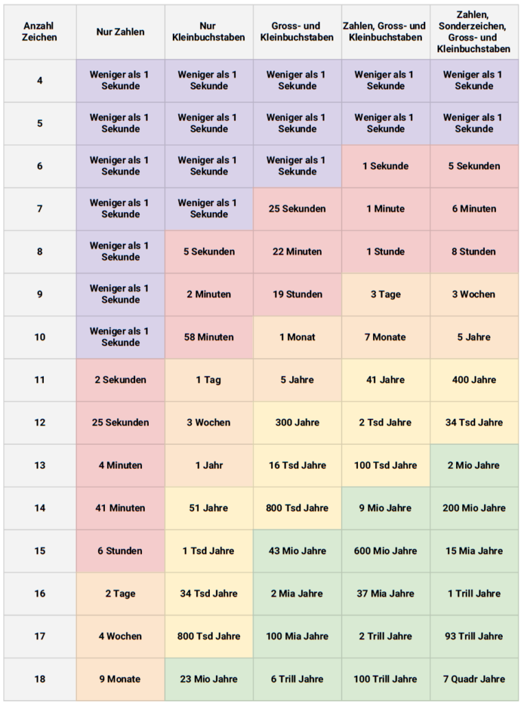 Wie lange Ihr Passwort einer Brute-Force-Attacke widerstehen kann, zeigt Ihnen diese Tabelle: