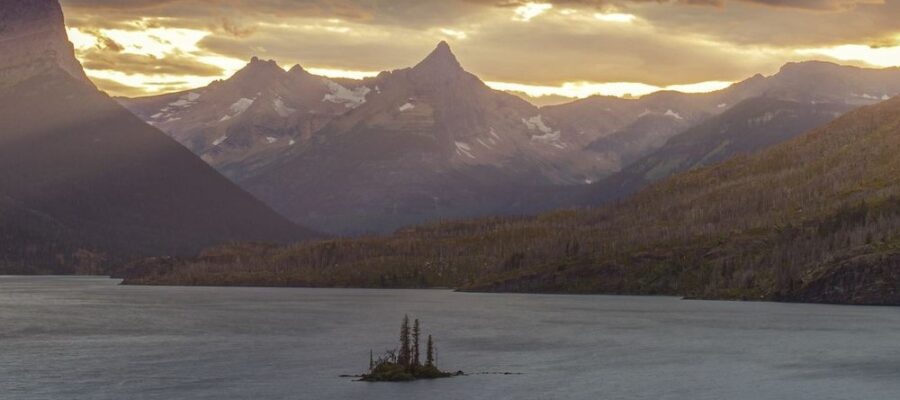 Ein See mit einer kleinen Insel und Berggipfel, die von der Sonne angestrahlt werden: Das Bild, das gerade die Runde
